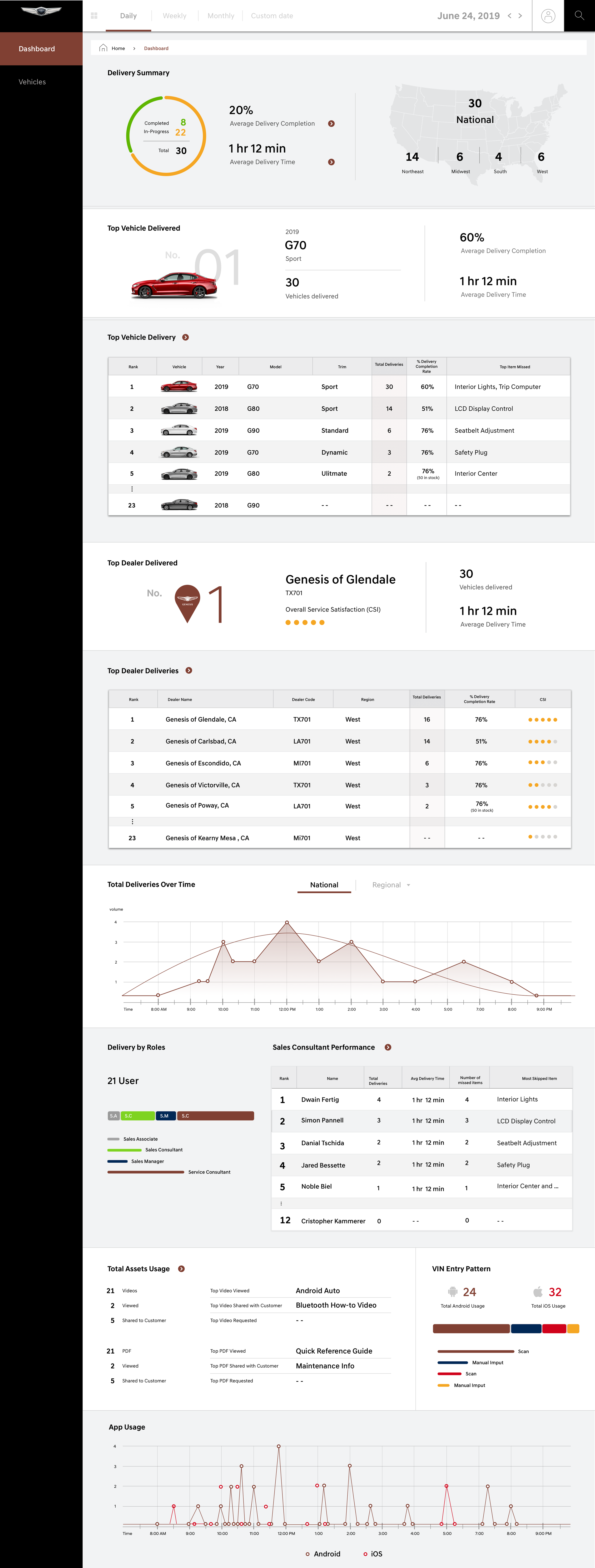Genesis dealerships needed a centralized, KPI-driven platform to streamline the sales and delivery process while improving communication between dealers and customers. Existing systems lacked real-time vehicle status tracking, seamless customer engagement, and connected vehicle insights, leading to inefficiencies in sales operations and delivery coordination.